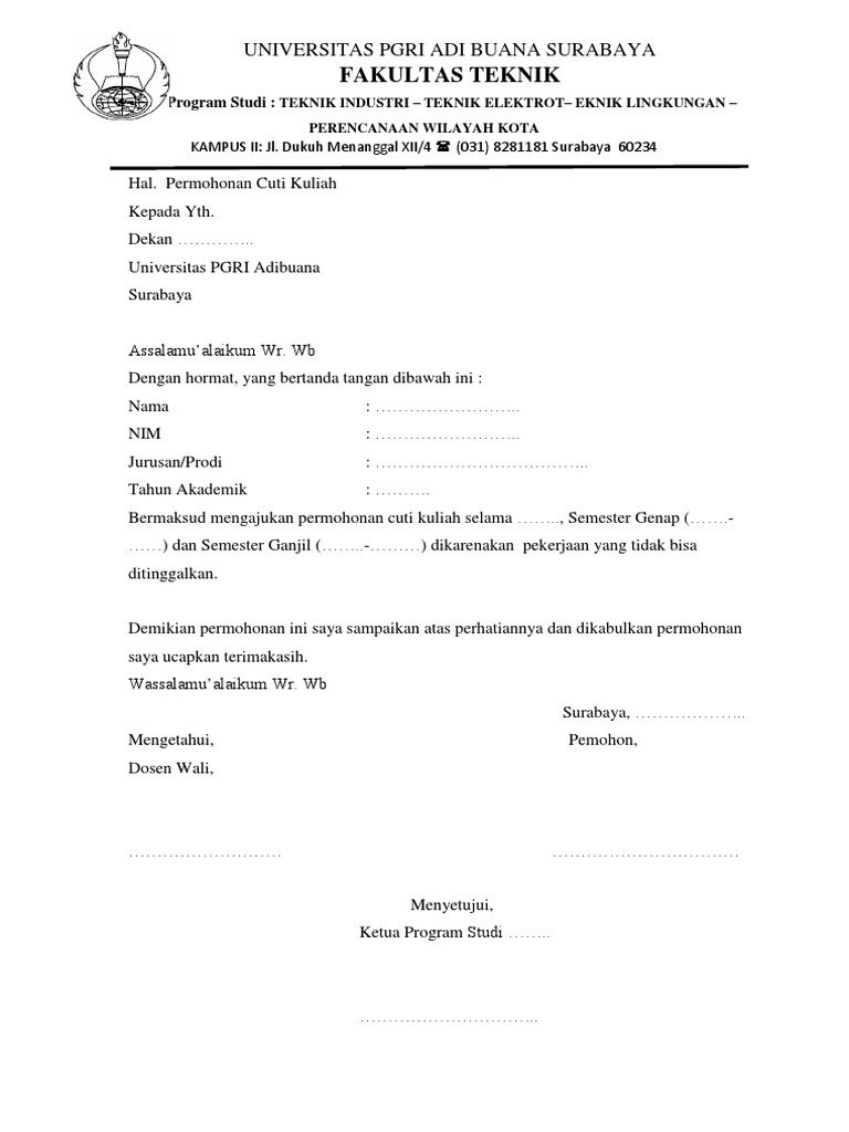 . Sebab tak sedikit mahasiswa yang harus cuti. Surat Keterangan pendukung jika adadiperlukan. Pengajuan surat permohonan cuti kuliah paling lambat 2.